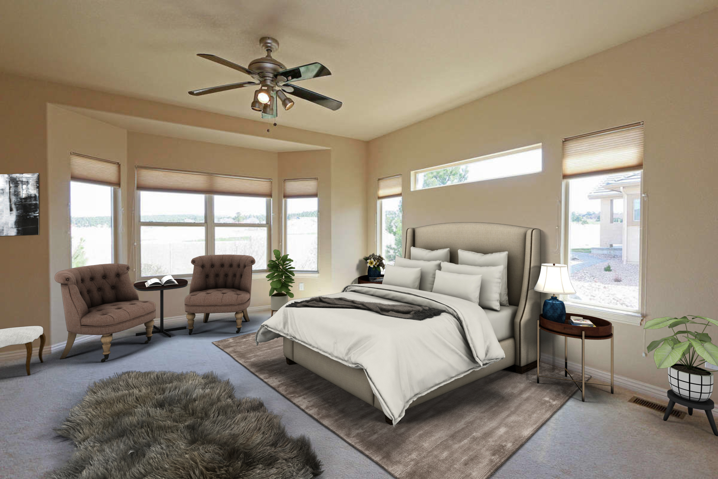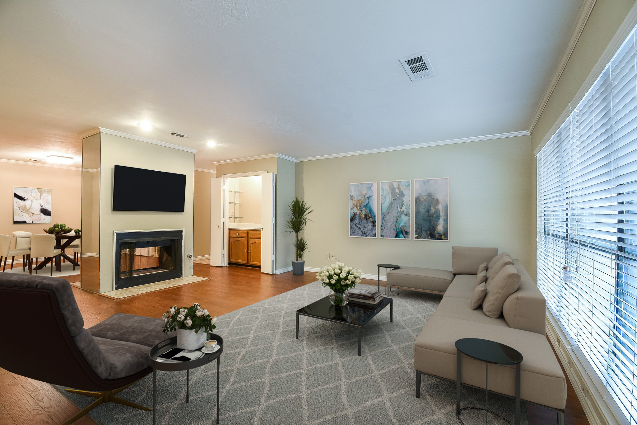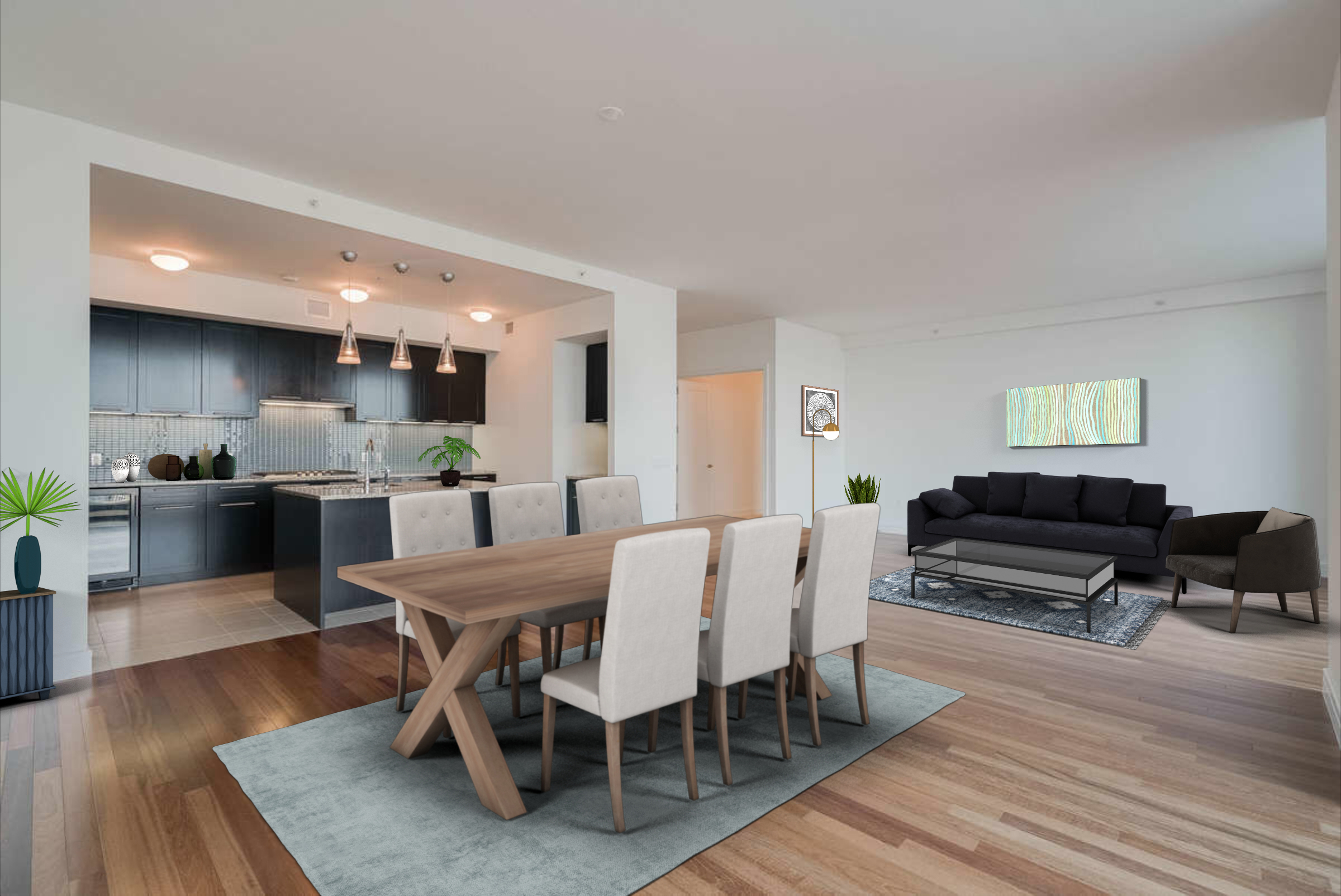 Beautiful light and airy spaces with a nod to beach/coastal through the use of colors and accessories. Have your room virtually staged using natural textures such as wicker, linen and timber to create that mixed matched sense of warmth and comfort. Imagine a big comfy linen sofa with a jute rug and timber coffee table, accessorized with wall art incorporating the beach or soft blue colors.