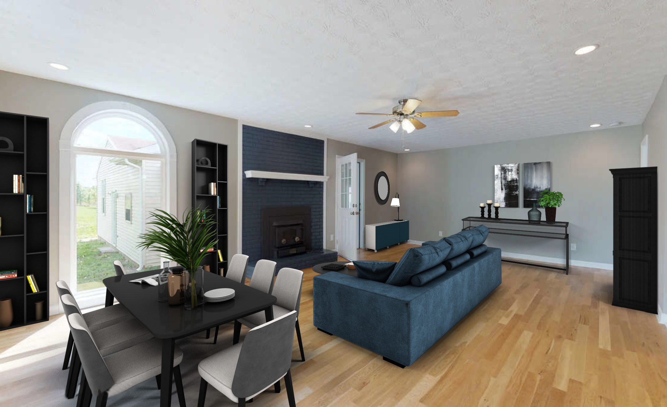 Minimal modern styling with an authentic vintage feel using contrasting and complimenting elements of new and recycled items. Imagine comfy couches, rugs, storage solutions used as décor and large indoor plants. Deep colors of black, gray and brown is visible throughout this style of staging.